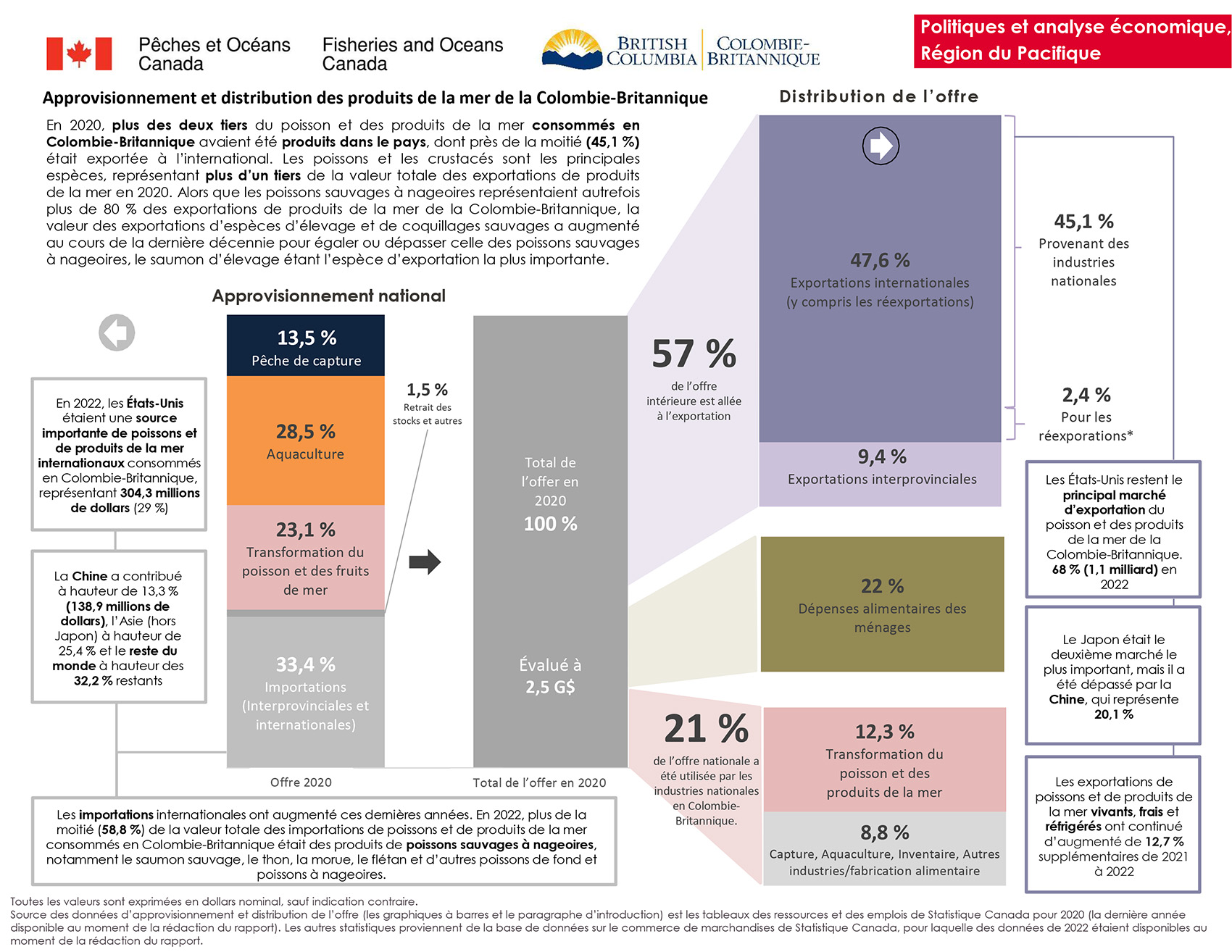 - 21 % de l’offre nationale a été utilisée par les industries nationales en Colombie-Britannique (12,3 % Transformation du poisson et des produits de la mer, et 8,8 % capture, aquaculture, inventaire, autre industries/fabrication alimentaire)