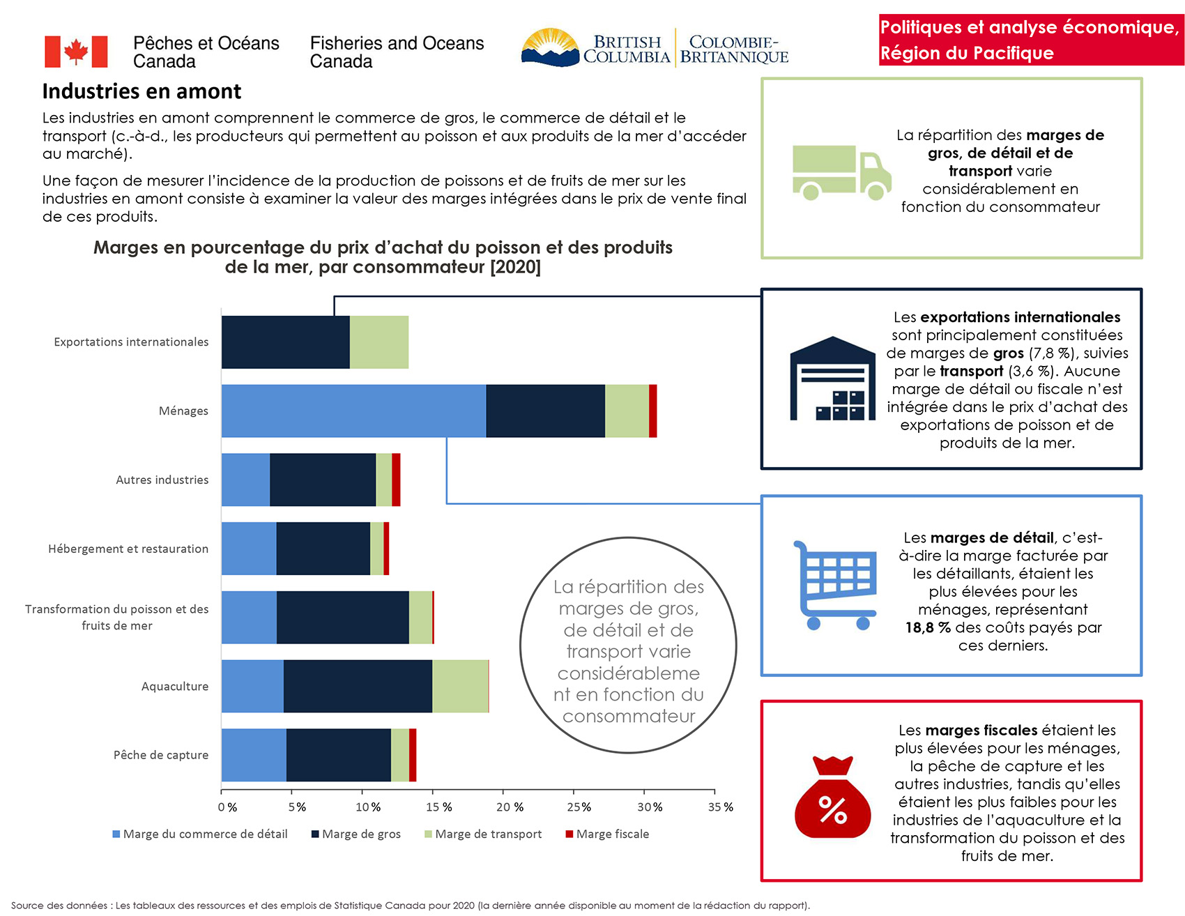 Les exportations internationales sont principalement constituées de marges de gros (7,8 %), suivies par le transport (3,6 %). Aucune marge de détail ou fiscale n’est intégrée dans le prix d’achat des exportations de poisson et de produits de la mer.