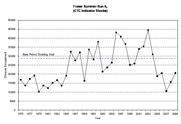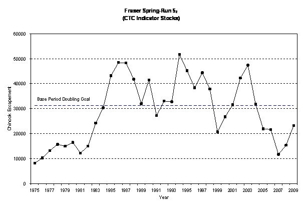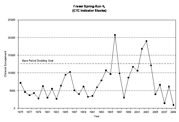 In the 2010 Salmon Outlook, Spring 42, Spring 52 and Summer 52 chinook have been classified as stocks of concern. Over the past 6 years, spawning escapements to these stock groups, known as Fraser River stream-type chinook, have declined steeply, especially those of the 42 spring aggregate. Escapements to several of those streams have declined to very low levels, including Louis Creek (6) and Coldwater River (26). In 2003, Nicola escapements exceeded 14, 000, but in 2009, they failed to exceed 500. Abundances of the 52 spring and summer aggregates are also fluctuating around 20 year lows[6], and it is possible that returns of those aggregates will be especially poor in 2010 as the smolts that will make up the majority of the 2010 adult return entered the ocean in 2007. To date returns from Fraser River salmon that entered the ocean in 2007 have been exceedingly poor, as seen by the Interior Fraser coho return in 2008 and the 42 spring chinook and sockeye returns in 2009.