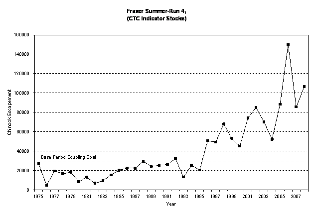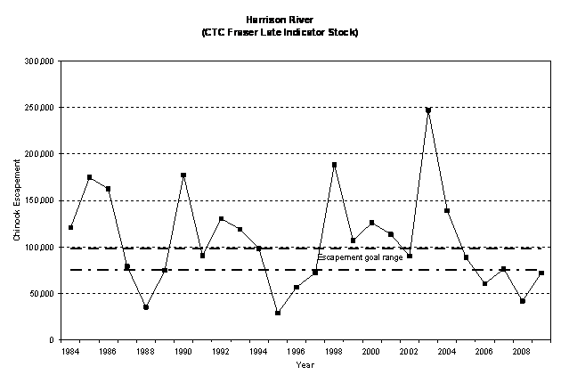 For Canadian and US fisheries, the 1999 agreement established a general obligation to reduce exploitation rates in the ISBM fisheries to 63.5% and 60.0% of the respective average exploitation rates during the 1979-1982 base period. If returns are less than the biologically-based escapement goal then the ISBM fisheries can be required to further reduce their exploitation rates to improve escapements. If returns are greater than the goal, then the harvest rates (and catch) in ISBM fisheries can be increased so long as the goal was still achieved. Only one Fraser River chinook stock has a biologically-based escapement goal (Harrison River) accepted by the PSC Chinook Technical Committee.