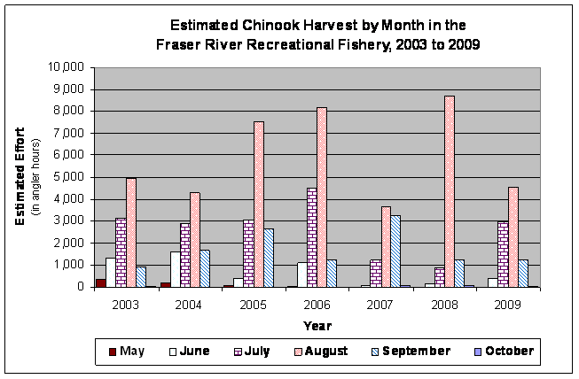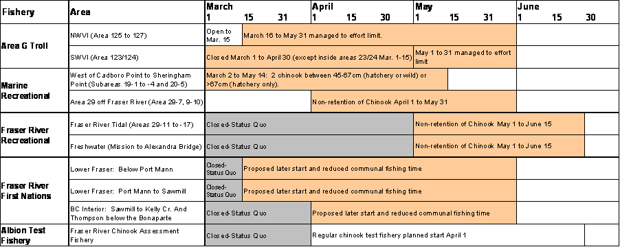 For management purposes in 2010, Fraser chinook stocks will be managed using the Spring 42, Spring 52, Summer 52, Summer 41 and Fraser Fall 41 (Harrison) management units employed under the Pacific Salmon Treaty (PST) process. This will align fisheries management objectives with indicator stocks, escapement, catch and exploitation rate data used in the PST process. As a result, the Early-timed Fraser chinook objective will not be used in 2010. Early-timed Fraser chinook, a sub-set of 7 stocks in 3 conservation units, are included in the Spring 42 and Spring 52 management units. New management objectives will be identified for Spring 42 chinook and for the combined management units of Spring 52 and Summer 52 chinook in the draft Southern BC Integrated Fisheries Management Plan for Salmon.