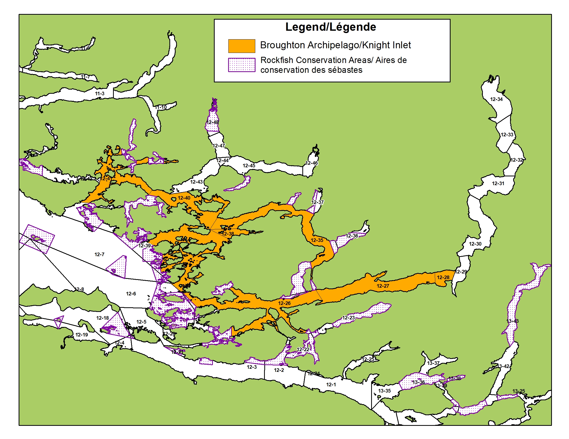 | Archipel Broughton et bras de mer Knight | Archipel Broughton et bras de mer Knight | La certaine partie du sous-secteur 12-26 au nord d'une ligne tirée de la pointe Dinner sur l'île Village par 50°37,628'N, 126°30,322'O en traversant jusqu'à un point le long du rivage opposé sur l'île Turnour situé par 50°37,536'N, 126°29,845' O; ET à l'est de la limite frontalière de l'ACS Lower Clio située par 50°35,397'N, 126°31,982'O; 50°34,943'N, 126°32,080'O ; la certaine partie du sous-secteur 12-39 au nord-est d'une ligne tirée de la pointe Gordon sur l'île Broughton située par 50°45,885'N, 126°44,158'O en traversant jusqu'à la limite frontalière de l'ACS sur l'île Eden Island par 50°45,510'N, 126°42,831'O ; les certaines parties du sous-secteur 12-39 à l'est de l'ACS des îles Eden-Bonwick-Midsummer-Swanson ; et la partie du sous-secteur 12-41 au nord d'une ligne en partance de la pointe Popplewell (50º50,756'N, 126º57,317'O) vers la délimitation de l'ACS à la pointe Bourmaster (50º50,700'N, 126º55,574'W); |