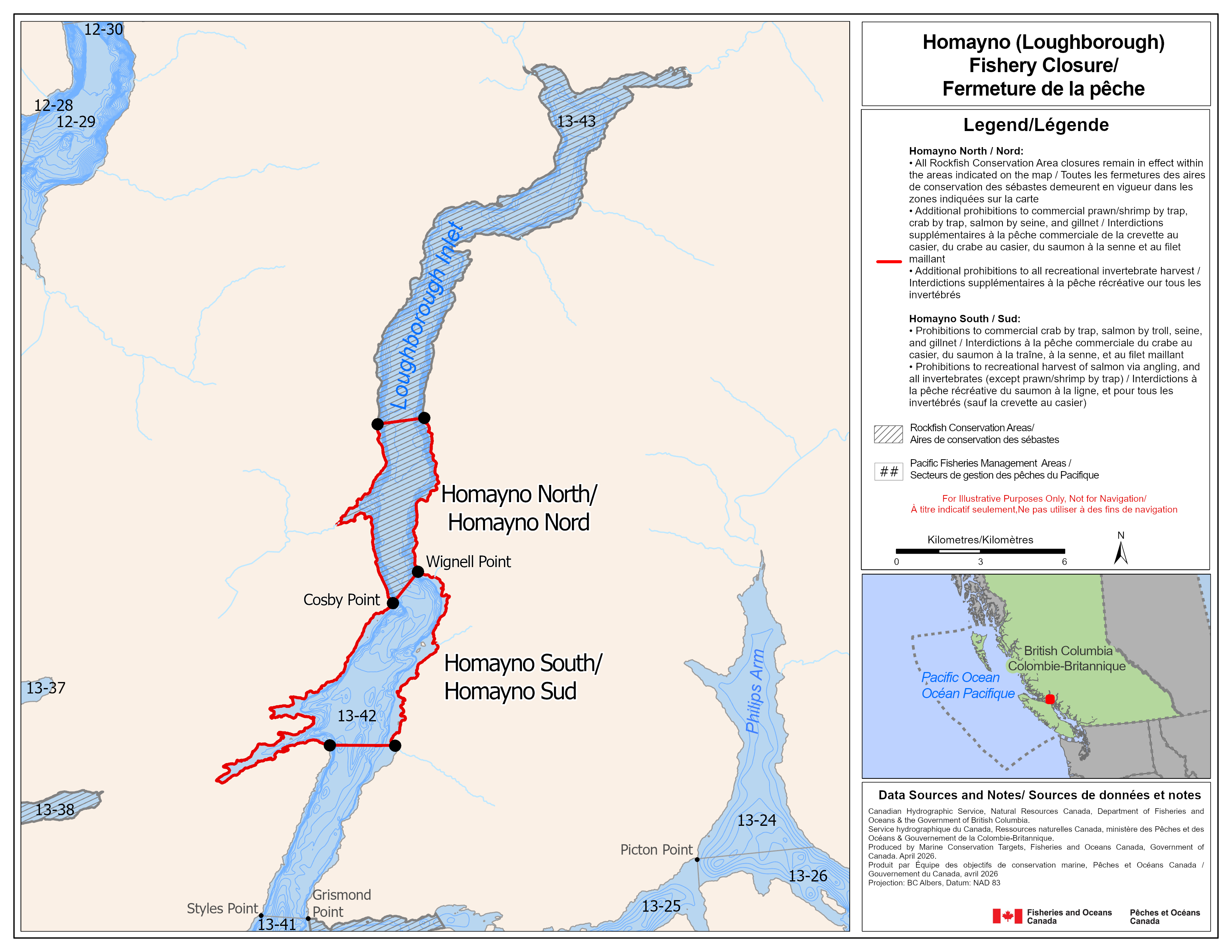 | Refuge marin proposé de Homayno - Partie sud | Refuge marin proposé de Homayno - Partie sud | Les eaux du sous-secteur 13-42 qui se trouvent à l'intérieur d'une ligne qui commence au point de Cosby à 50°33,031'N, 125°32,995'O, puis vers le nord-est au point de Wignell à 50°33,633'N, 125°32,228'O, puis vers le sud suivant le littoral à 50°30,290'N, 125°32,949'O, puis vers l'ouest à 50°30,305'N, 125°34,930'O, puis vers le nord suivant le littoral jusqu'au point de départ. |