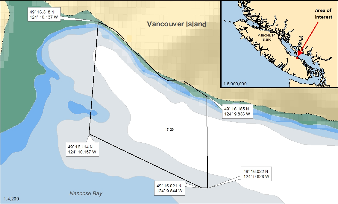 | 17.4 Port de Nanaimo | 17.4.png | La zone intertidale de l'île Newcastle à partir de la pointe Shaft à 49°11,68' de latitude nord et 124°56,83' de longitude ouest jusqu'à la pointe Nares à 49°12,17' de latitude nord et 124°56,61' de longitude ouest, et les eaux et la zone intertidale du havre Nanaimo et du passage de l'île Newcastle à l'intérieur d'une ligne qui commence à la pointe Jack à 49°10,00' de latitude nord et 124°53,68' de longitude ouest, de là jusqu'à la pointe Gallows sur l'île Protection à 49°10,23' de latitude nord et 124°55,08' de longitude ouest, de là en suivant le rivage ouest de l'île Protection jusqu'à la pointe Batchelor à 49°10,99' de latitude nord et 124°54,95' de longitude ouest, de là jusqu'à une pointe sans nom au rivage de l'île Newcastle situé par 49°11,38' de latitude nord et 124°55,34' de longitude ouest, de là en suivant le rivage sud de l'île Newcastle jusqu'à la pointe Shaft à 49°11,68' de latitude nord et 124°56,83' de longitude ouest, de là jusqu'à la pointe Pimbury à 49°11,60' de latitude nord et 124°56,94' de longitude ouest, et de là en suivant le rivage jusqu'au point de départ à la pointe Jack. [NAD83] |